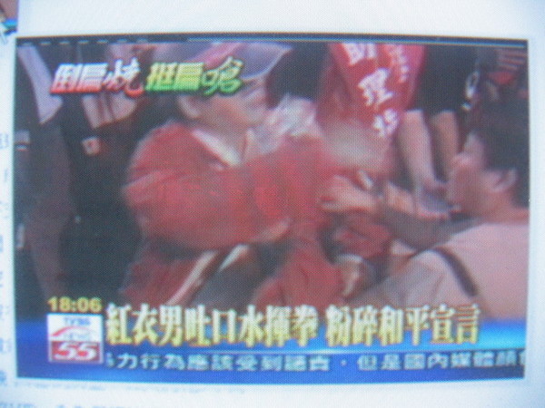 倒扁民眾:「你滾回去。」挺扁民眾:「我是台灣人,台灣國萬歲,台灣國萬歲!」倒扁民眾:「你再講一次?」挺扁民眾:「台灣國!台灣國!」